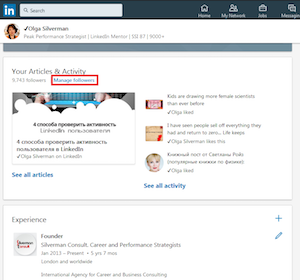 Manage followers - незаметный раздел, с очень важной информацией. В нем вы увидите, тех, кто по какой-то причине подписался отслеживать вас, но в контакты 1 уровня не попросился - тихие читатели. А ведь это могут быть ваши потенциальные клиенты, партнеры - в общем все те, кто уже вас точно знает.