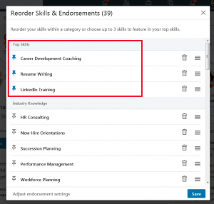 Раздел Skills в новом интерфейсе LinkedIn состоит из четырех частей (раньше на части не делился, можно было только вручную менять навыки местами):